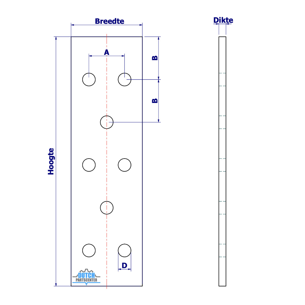 | Hoogte | Breedte | Dikte | Gat diameter | Maat A | Maat B |