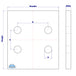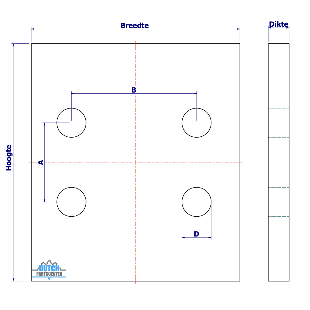 | Hoogte | Breedte | Dikte | Gat diameter | Aantal gaten | Maat A | Maat B |