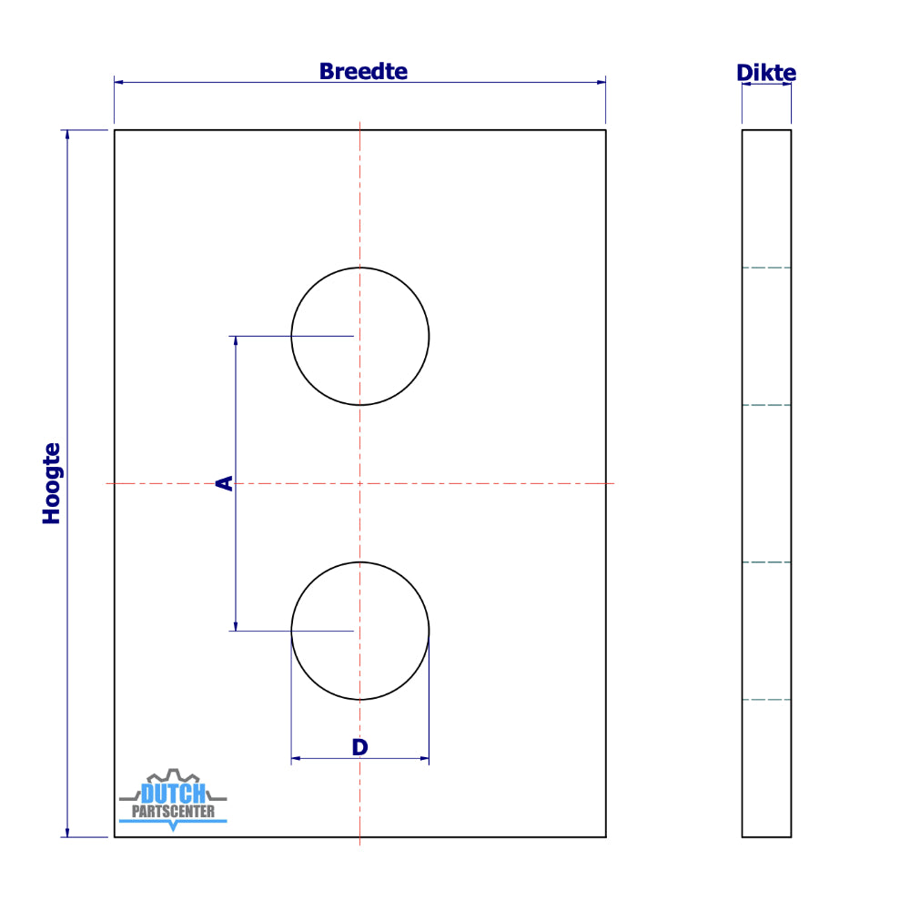 | Hoogte | Breedte | Dikte | Gat diameter | Aantal gaten | Maat A |