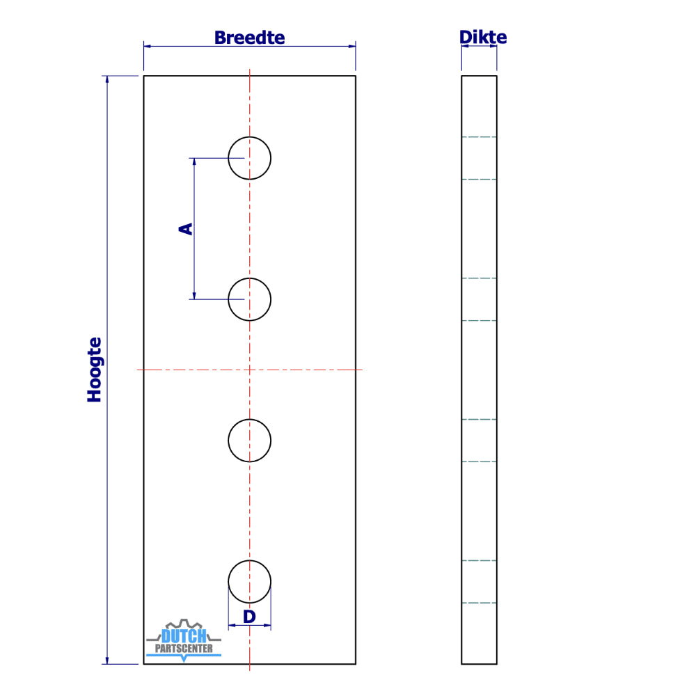 | Hoogte | Breedte | Dikte | Gat diameter | Aantal gaten | Maat A |